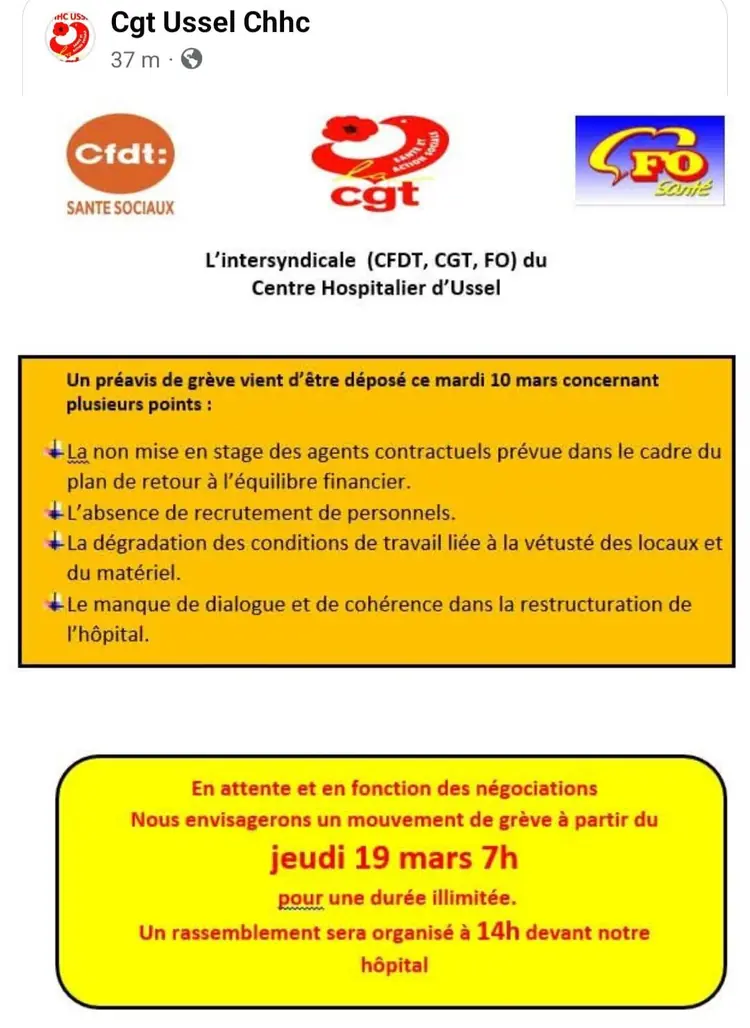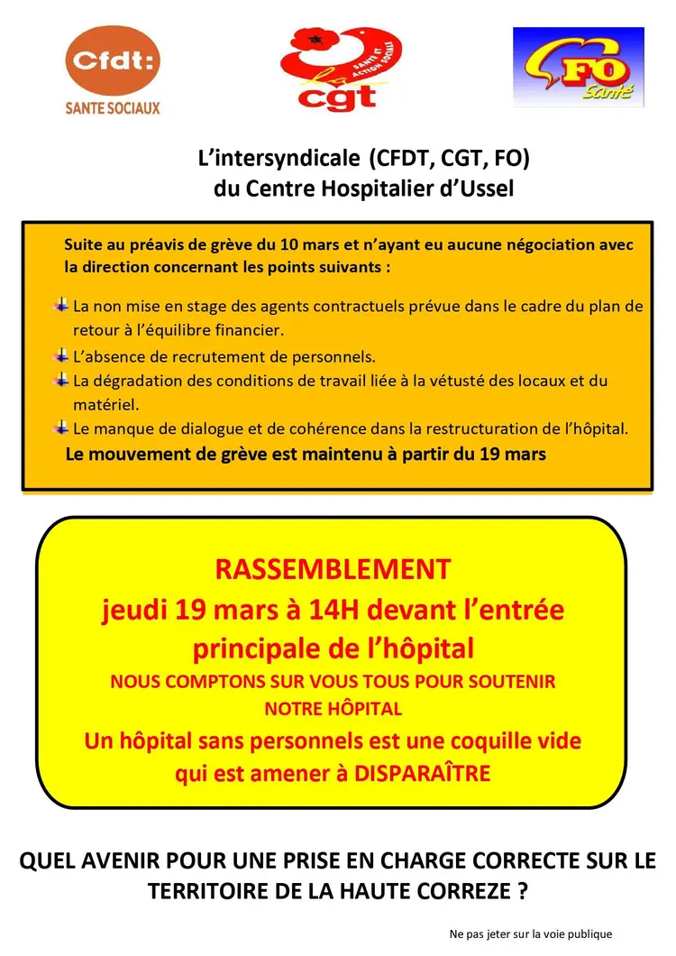 Appel intersyndical à soutenir les personnels du CH Ussel en grève le 19 mars 2026 à 14h devant l'hôpital.