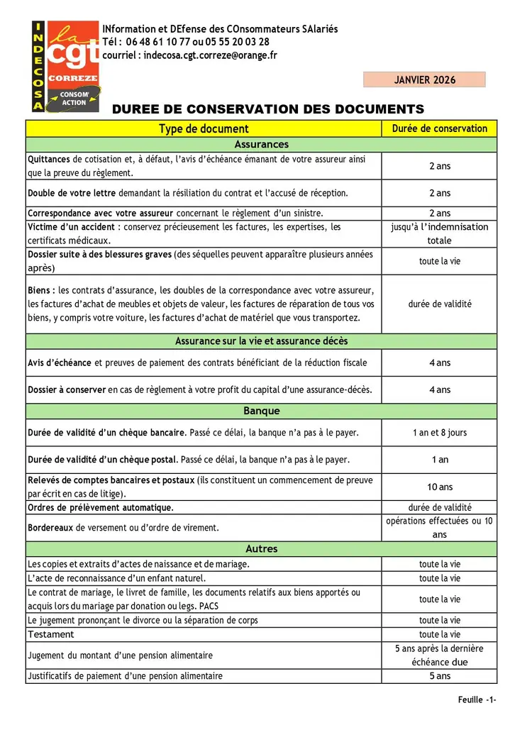 INDECOSA : Durée de conservation des documents