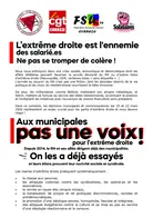 Aux élections municipales des 15 et 22 mars prochain, pas une seule voix pour l'extrême droite !! On vous dit pourquoi dans le tract intersyndical CGT-FSU-SOLIDAIRES ci-joint. Partagez largement à vos contacts.