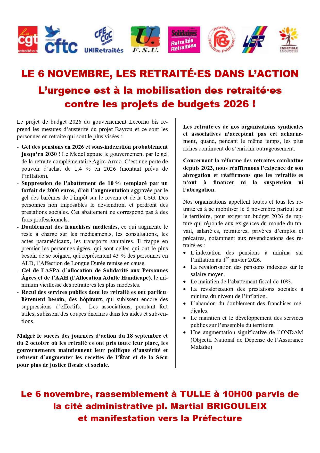 A l'appel de 8 organisations syndicales : Le 6 novembre, rassemblement à TULLE à 10H00 parvis de la cité administrative pl. Martial BRIGOULEIX et manifestation vers la Préfecture.